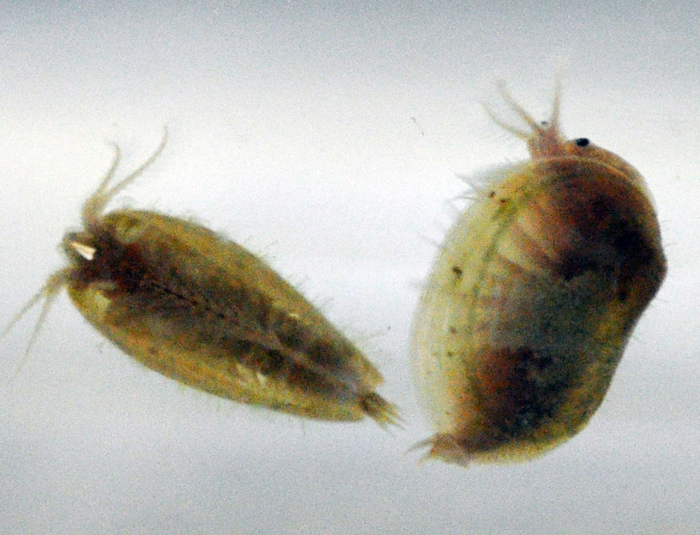 富山市の水田で採取したカイエビ。カイエビ類はリズミカルなメタクローナル波を作る遊泳肢と殻から外に張り出して大きく振っている第二触覚で泳ぐ。アクリル容器に入れてその様子を撮影していたら、側面と腹面を向けた2個体がうまく並んでくれた。